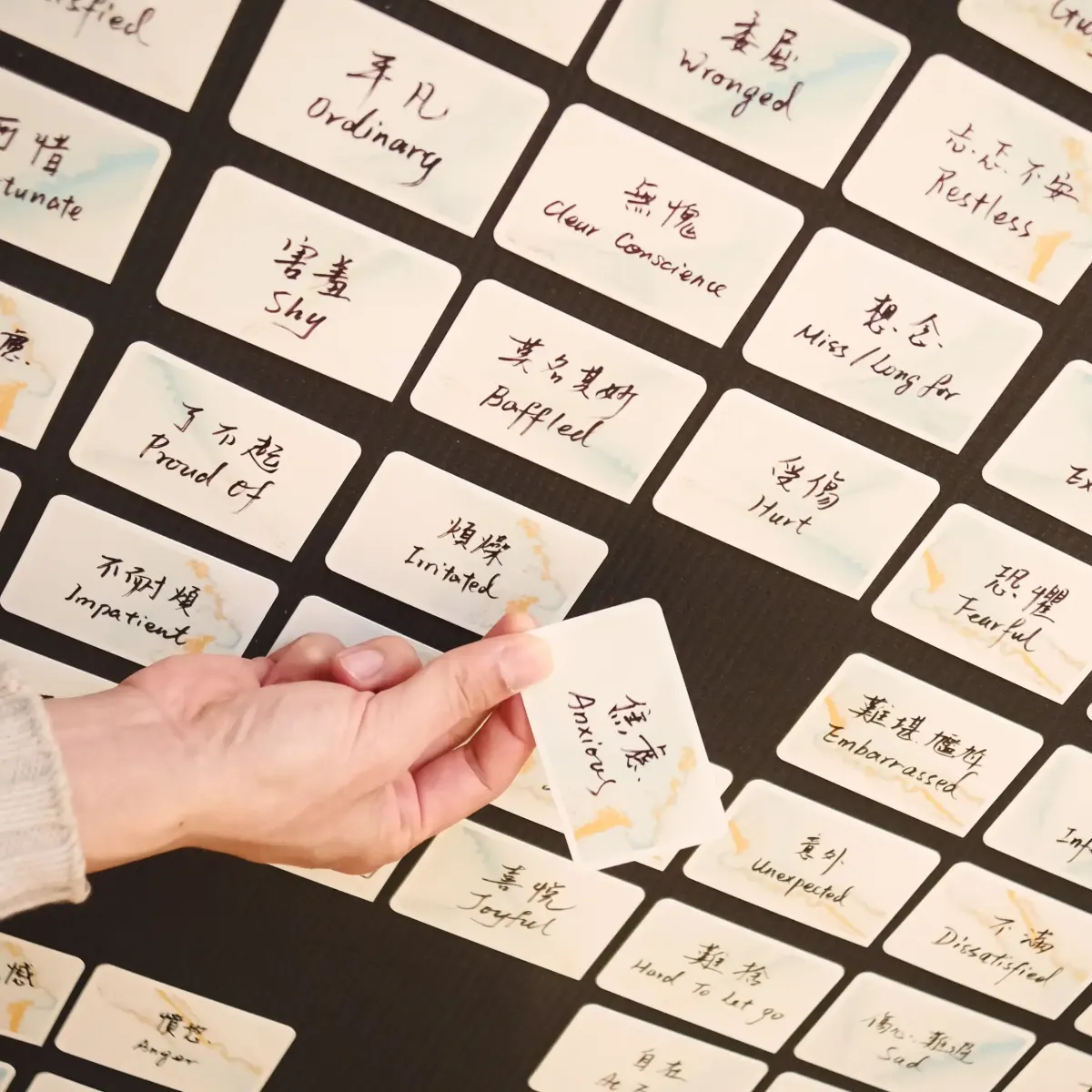 我們挑選出在療癒過程中最常碰到的情緒感受,全套包含 88 張情緒詞卡 + 2 張空白卡,結合中英文雙語,涵蓋從「恐懼、焦慮、沮喪」到「喜悅、感恩、自在」等多層次人類情感光譜。