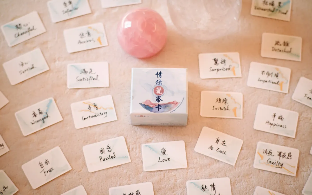 卡片受多年前有心人贈送的「情緒應對卡」所啟發,結合 Mei 多年的教學及個案療癒應用,有感在坊間無法找到合心意的情緒卡,決定製作一套新卡,將我們的祝福和能量寄存其中。